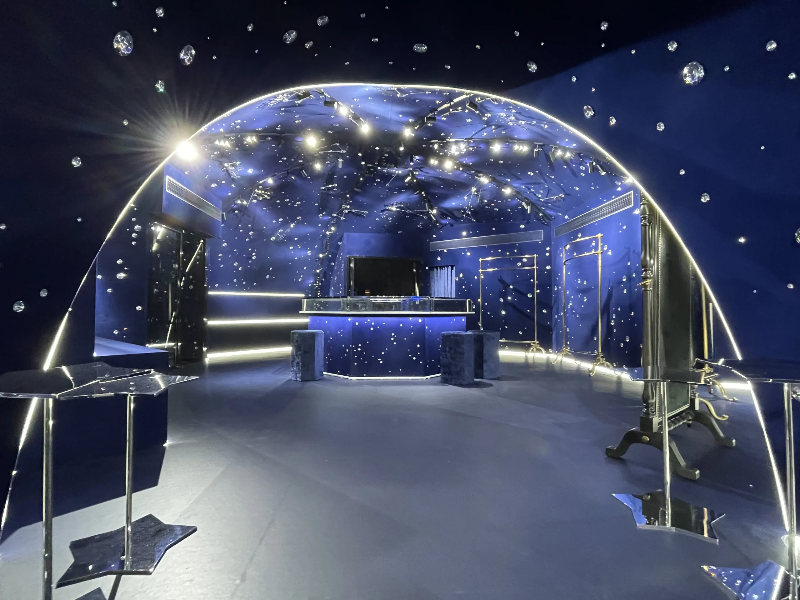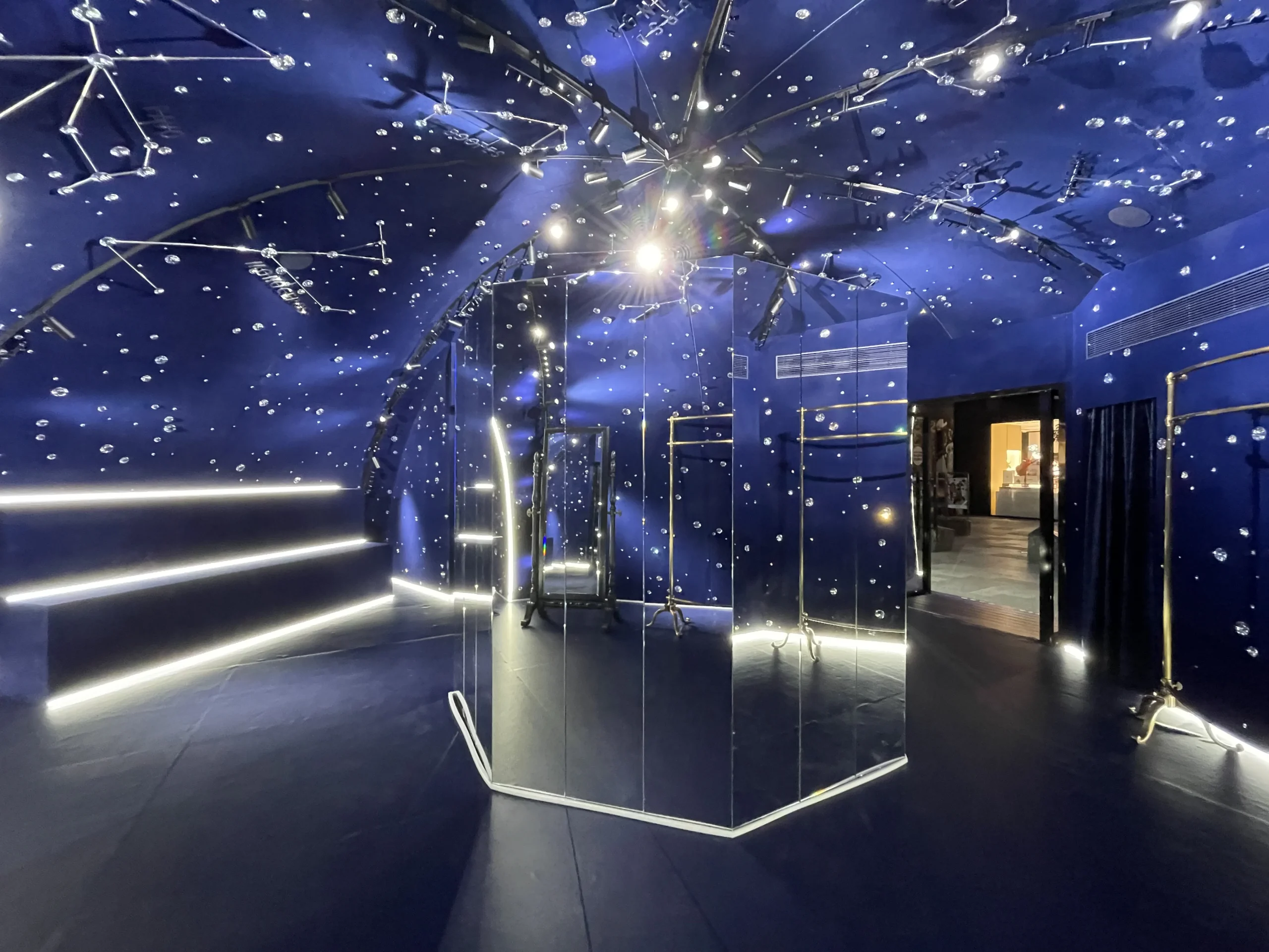 The walls of the pop-up are bathed in a soft, celestial blue hue. The rich, deep blue of the moquette complements the color scheme of the walls, creating a cohesive and immersive environment that feels both luxurious and comforting.